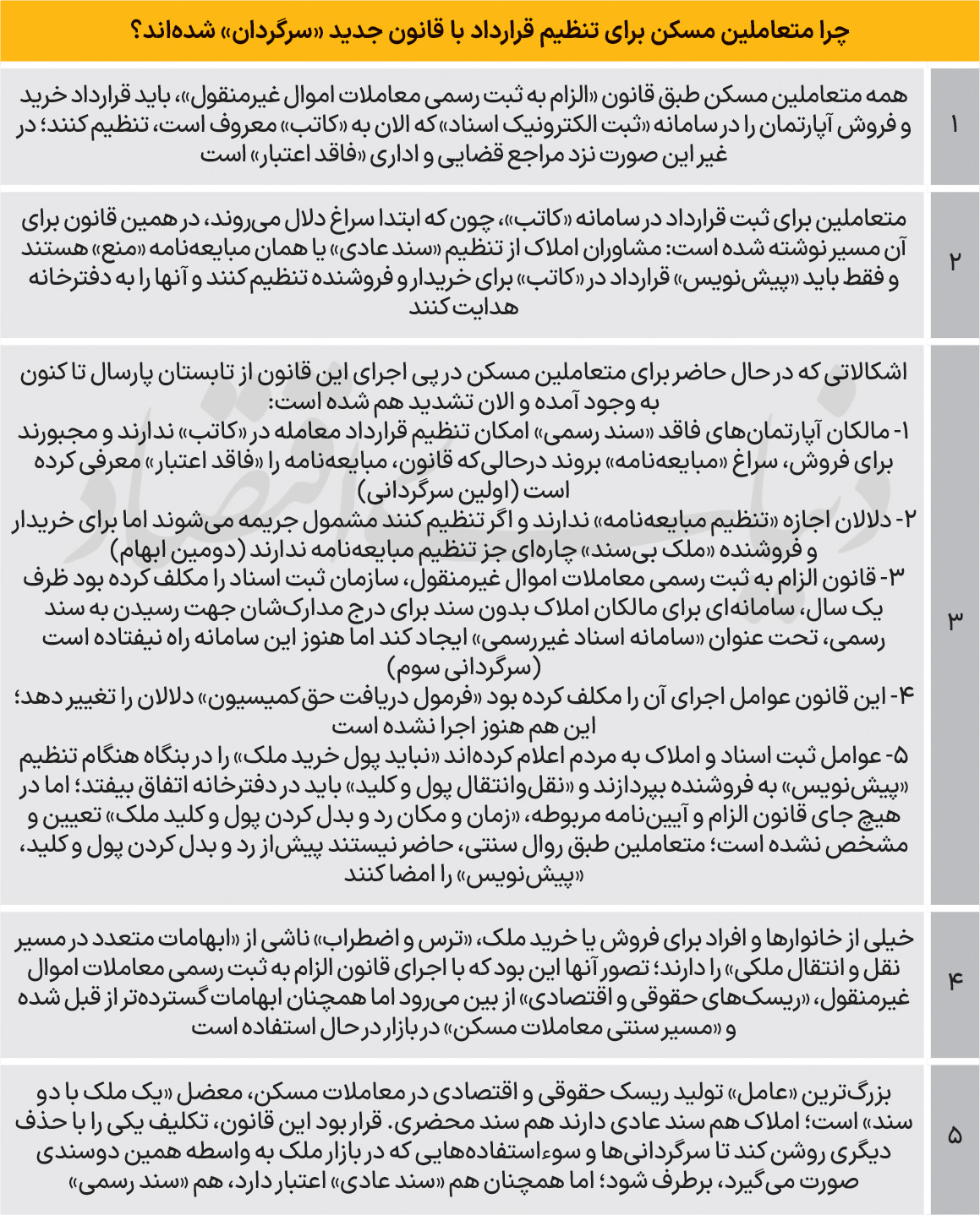 این قیود سه‌گانه در قانون، یعنی «انجام معامله مسکن فقط از طریق سامانه ثبت الکترونیک»، «منع شدن تنظیم مبایعه‌نامه» و «مجاز بودن دلالان فقط به تنظیم پیش‌نویس»، که از سال گذشته تاکنون در بازار معاملات مسکن برقرار بوده، به خاطر «ناسازگاری با شرایط واقعی بازار»، عملا ابهامات خریداران و فروشنده‌ها را بیشتر از قبل کرده است. اولین باگ در مسیر اجرای این قانون که ابهام بزرگی برای بخشی از خانوارها و متعاملین مسکن درست کرده، «سکوت مجریان قانون در برابر مبایعه‌نامه» است. هدف طراحان قانون الزام به ثبت رسمی معاملات اموال غیرمنقول آن بود که معضل «یک ملک، دو سند» یک بار برای همیشه برطرف شود و کسانی که قصد خرید آپارتمان دارند بدون آنکه مجبور به «امضای سند عادی یا همان مبایعه‌نامه» در مرحله اول و سپس «انتظار طولانی برای رسیدن به سند رسمی (محضری)» در مرحله آخر باشند، بتوانند در فرآیندی ساده، روشن و مشخص، به محض عزم برای معامله، تنها یک سند معتبر دریافت کنند.